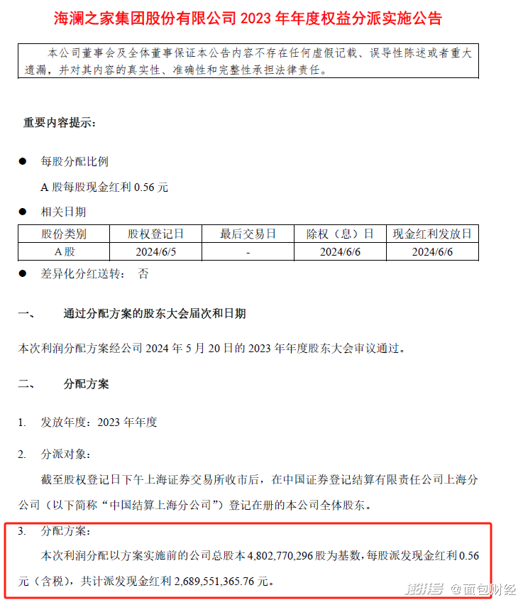 海瀾之家2023年年度權益分派實施公告顯示,公司2023 年年度分配方案為:以方案實施前的公司總股本4,802,770,296股為基數,每股派發現金紅利0.56 元(含稅),共計派發現金紅利 2,689,551,365.76 元。