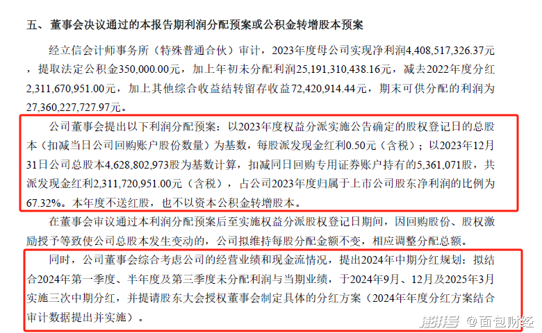 雅戈爾2023年年報顯示,公司董事會提出以下利潤分配預案:以2023年度權益分派實施公告確定的股權登記日的總股本(扣減當日公司回購賬戶股份數量)為基數,每股派發現金紅利0.50元(含稅);以2023年12月31日公司總股本4,628,802,973股為基數計算,扣減同日回購專用證券賬戶持有的5,361,071股,共派發現金紅利2,311,720,951.00元(含稅),占公司2023年度歸屬于上市公司股東凈利潤的比例為 67.32%。本年度不送紅股,也不以資本公積金轉增股本。
